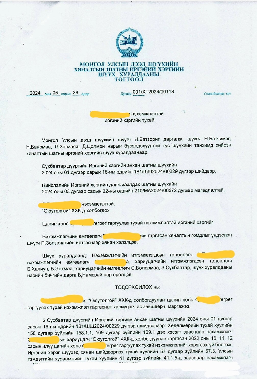 МОНГОЛ УЛСЫН ДЭЭД ШҮҮХИЙН ХЯНАЛТЫН ШАТНЫ ИРГЭНИЙ ХЭРГИЙН ШҮҮХ ХУРАЛДААНЫ ТОГТООЛ.